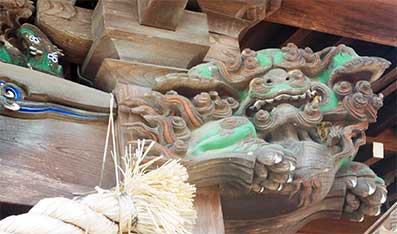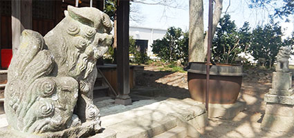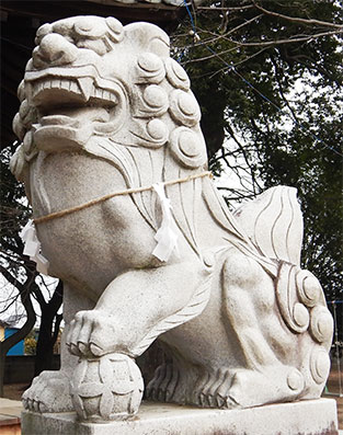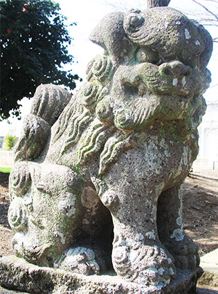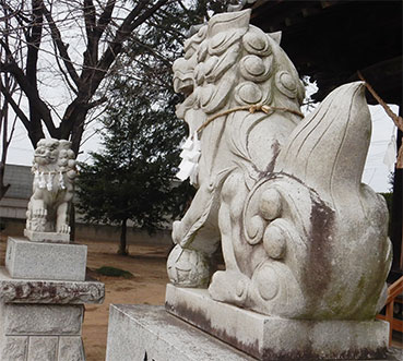 拝殿の前に置かれた狛犬は新しいタイプの小型の石像です。機械で彫られたと思われる石像としてはかなり出来の良い作りに見えました。模様が刻まれた玉取りの意匠、各部の彫りに立体感が感じられました。