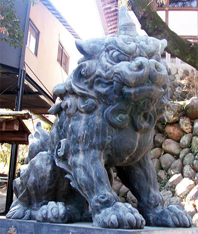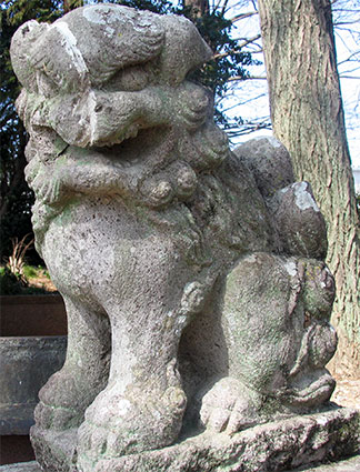 右に置かれた吽像は若干小型ながら手彫りの石像。やはり今まで私の乏しい経験で見た狛犬とは少し異なる雰囲気を醸し出しているようです。