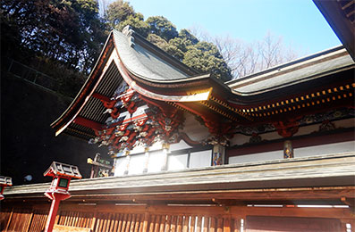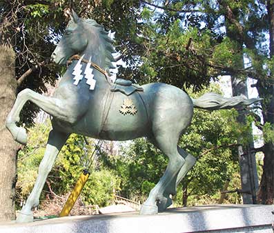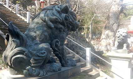 広い境内の鎮座する本殿の前に奉納された狛犬が置かれているのが見えます。