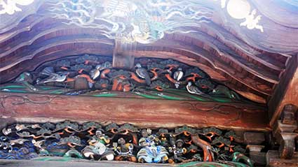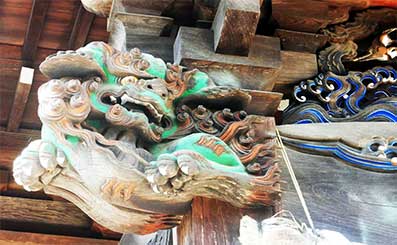 所謂岡崎式とも呼ばれるしばしば目にする小型の新しい狛犬です。右の阿像、玉取りの意匠でまだ新しいせいかかなり赤い彩色が目立って見えます。