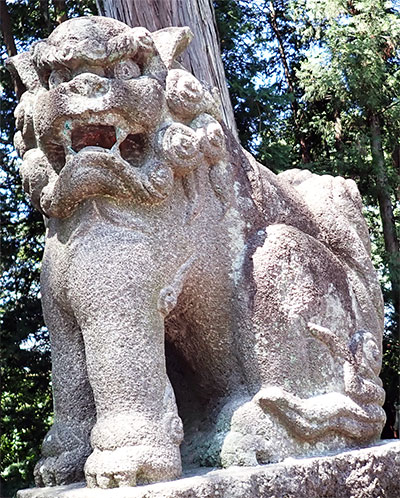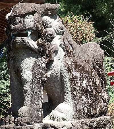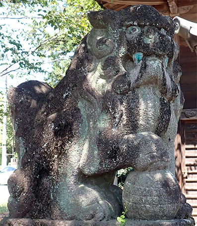 狛犬としては一般的なサイズの右に置かれた阿像。牙が目立つ意匠や目の彫りなどが先ほど見た榛東村・八幡神社の昭和10年狛犬に似ているような印象を受けます。