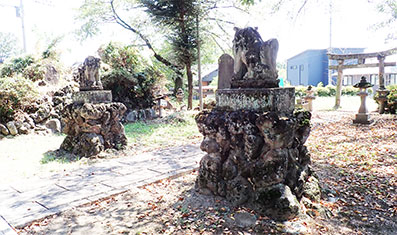 拝殿の前には風雅な自然石の石組みの上に祀られた狛犬が見えます。