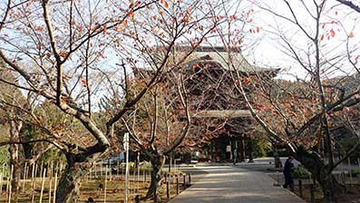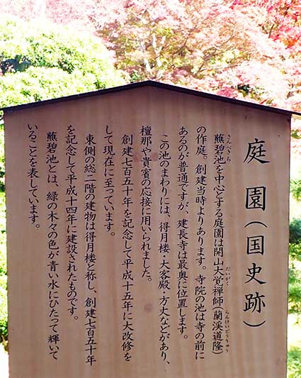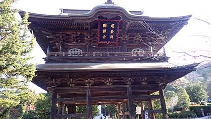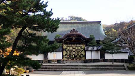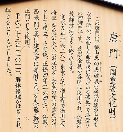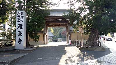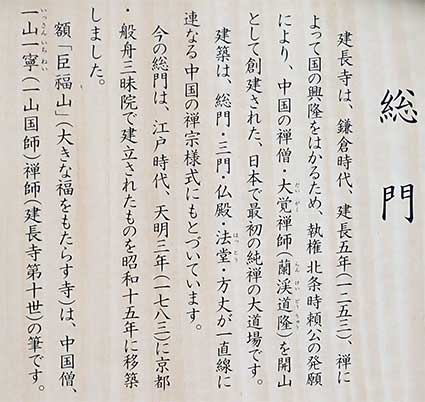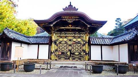 豪華絢爛な方丈(龍王殿)の正門である唐門の前に立っています。この門は落ち着いた中間色が目立つ建長寺ではかなり目立つ姿の美しい門です。