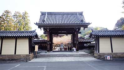 【A三門】桜の木らしきものが植えられた庭の先に広大な門が見えて来ました。