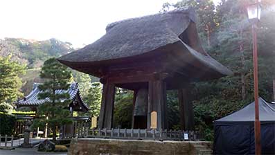 【C梵鐘】大きな三門の右に重厚な茅葺屋根の建物の中にいかにも古い作りの釣り鐘が見えます。梵鐘脇に置かれた説明によれば国宝との事、再度どっしりした鐘を見上げてみました。