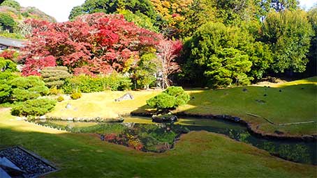 先ほど見た二階建ての建物・得月楼の外廊下から、通り過ぎて来た方向の庭を見ています。紅葉が緑の森に彩を添えて秋の陽の光の下で輝いて見えました。