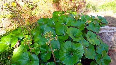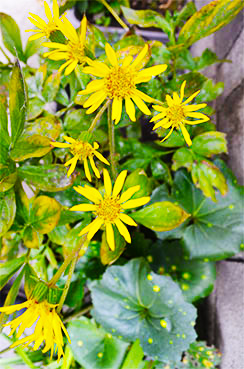 村の庭の築山の上に植えた斑入りのつわぶきを街に移植したものです。村から移植したつわぶきは斑入りの葉が綺麗です。