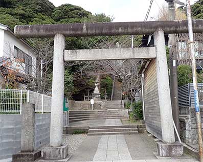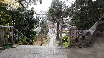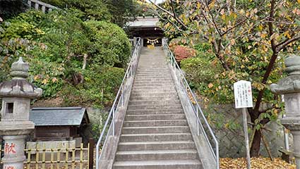 大通りから左に折れて氏子の人達の暮らす屋並みの中の道を進むと鳥居が見えてきます。小山の上に鎮座する神社に登る長い石段が続いていました。