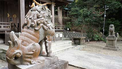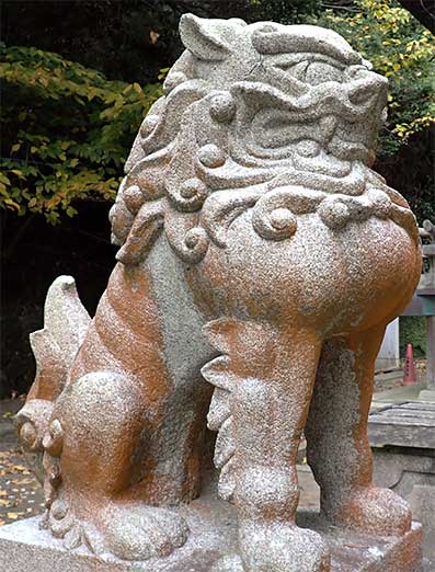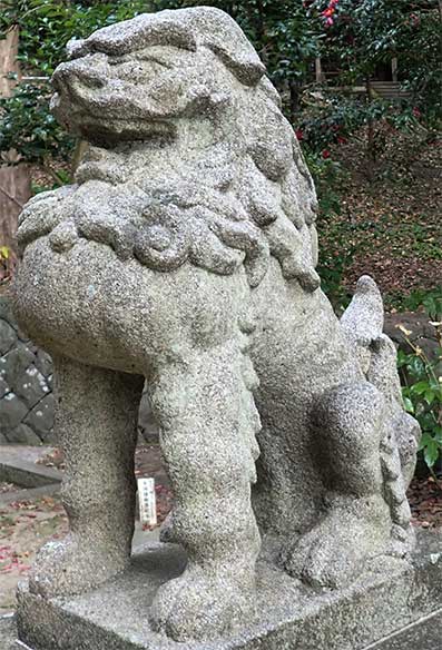 12:19・お参りを前に参道の脇に置かれた狛犬を見させてもらうことにします。右に置かれた阿像は通常の大きさです。胸を張るその姿は辺りを威圧する力が漲るように感じさせます。 意匠は現在の機械彫りの姿に似ていますが、当時は手彫りで狛犬を彫る石工の人達が各地にいた時代ですからこの狛犬も石工の腕と意図が表現された石像と思われます。