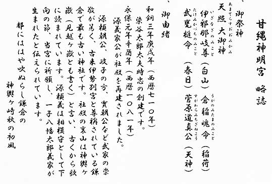 私の読んだ案内所には鎌倉で最も古い神社と書かれていましたが、和銅3年(710年)創建の説明を見て嬉しくなりました。 それはまさに平城京遷都の年です、奈良の都が好きな私には大きなプレゼントです。先ほど参拝した長谷寺と言いこの甘縄神明宮と言い、鎌倉の町は奈良時代との繋がりが色々あるとは大きな喜びです。
