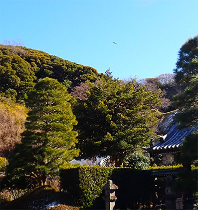 10:49・梵鐘の周りを移動しながら鑑賞していると左の青空の中を鳶の類の鳥が滑空しながら建長寺の境内を旋回していました。
