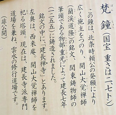 梵鐘の説明、如何にも重そうな重厚な作りは重さが2.7トンと書かれていることで納得できます。初詣に訪ねた北鎌倉駅近くの円覚寺の国宝・洪鐘(おおがね)を思い出します。