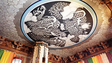 千手観音と釈迦苦行像の置かれた法堂の天井一杯に躍動する雲龍画が描かれています。