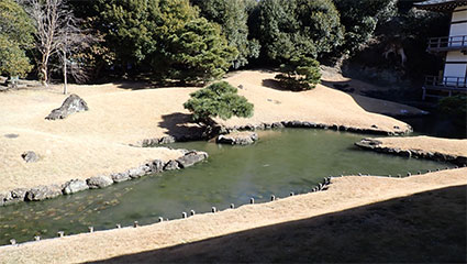 11:03・方丈の裏の庭園に進む廊下ですこし迷っているので右に曲がる事を教えてあげました。前回の参拝時とは様子が大きく変わり池の水が一面の氷に覆われていました。方丈を出て彼に地図を出してもらって進路を教えてあげました。
