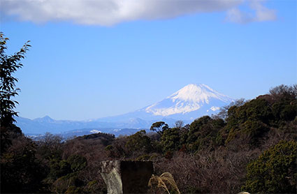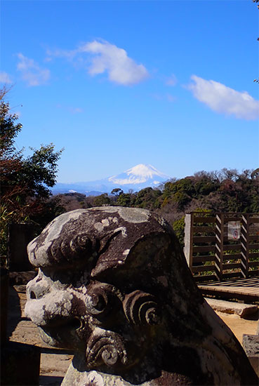 11:30・【富士見台】半僧坊での参拝をすませて楽しみにしていた富士見台に向かいます。半僧坊境内に祀られた狛犬頭の上から冠雪の富士山と青空が広がっている景色が見えました。
