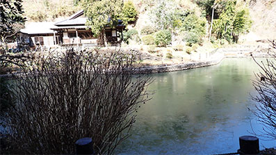 12:18・静まりかえった大覚池の入り口近くのベンチに座って持参のお茶を飲みながら弁当を食べます。食べ終わってから余りも寒いので日当たりのよい池の上流部に向かいました。