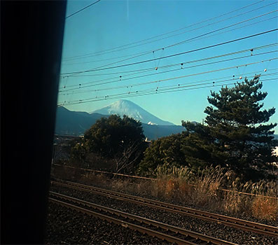 余り電車の旅に慣れていないので、ボックス席の普通電車の車窓の風景にくぎ付けになります。突然冠雪の富士山が右手に見えてきました。