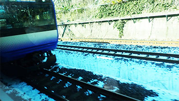 8:36・渋谷駅を過ぎるとラッシュアワーの電車もすっかり人混みが消えて座席に座ることが出来ました。前夜来の雪が、通り過ぎる家並の屋根にかなり重たげに積もっています。線路にも雪が解けずにあたかも雪国を思わせる風景が続きます。