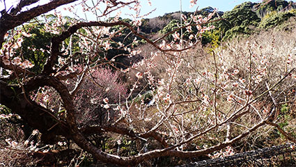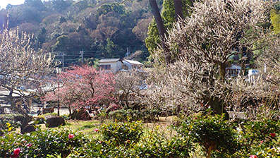 11:03・庭園の近くには紅梅と競うように白い梅も咲いています。この辺りまで来る人は少なく静かに眼下に広がる春の梅の風景を堪能できました。梅園の終点に来たのでこれから初川の流れの反対側・右岸に向かうことにします。
