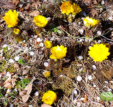 10:48・足元の地面に福寿草が姿を見せてくれています。厳しい冬に花を開かせて春の気配を教えてくれる大好きな花です。