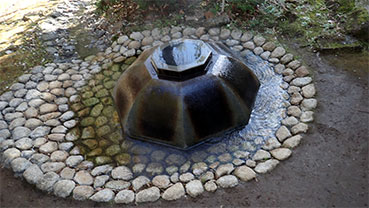 10:59・【足湯】梅園の坂道を最奥まで登って行ってみました。温泉が溜まったようなタイル張りの場所があります。指先を入れるとあたたかなおお湯がたまっていました。入口でもらったパンフレットによると足湯のようです。