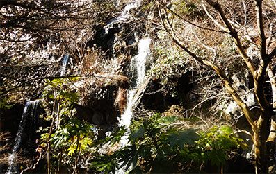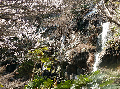 11:21・滝沿いの道を歩きながら梅の花の先の滝の流れを眺めています。