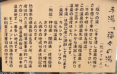 案内板には手湯”福々の湯”と書かれています。試しにちょっと指を湯に付けてみました。近くの伊東温泉でも街の通りに幾つかの手湯が有ったのを思い出しました。