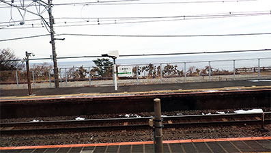 13:50・根府川駅に到着、ホームの先には海が広がっています。