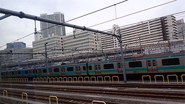 15:11・電車の窓からこれほどゆっくりと東京の街の風景を眺めた事はありません。新橋を過ぎると殺風景な街並みや広い線路が続く印象がありますが、ゆっくり眺めるとビルの立ち並ぶ風景に激変しています。