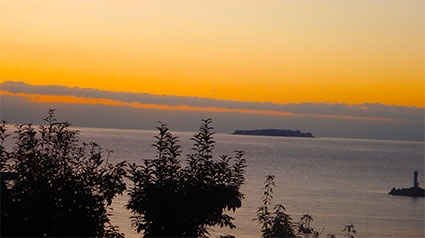 初島の島影がまるで戦艦の様に見えます。右には熱海の海の小さな灯台が青い光線を時折海に向かって投げかけていました。