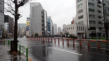 大好きな日比谷通りも雨の降る夕方のせいか静まり返っていました。帝国ホテル方向を眺めてからJR有楽町駅に向かいました。