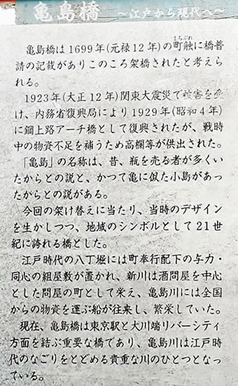 説明板に書かれた江戸時代、酒問屋が並んだ新川は既に埋まってしまいましたが亀島橋は橋げたが銅板の飾りを施された江戸らしいさっぱりした美しさの橋です。