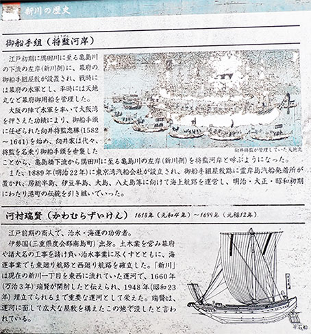 もう一つの説明板には御船手組と川村瑞賢の説明が見られました。かっては亀島川の隅田川への流れ込み部にあった御船手組のあたりも(江戸の古地図をご覧ください)全て埋め立てられておりその面影はありません。