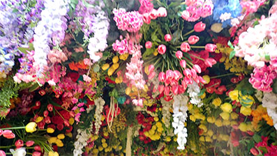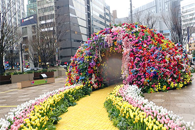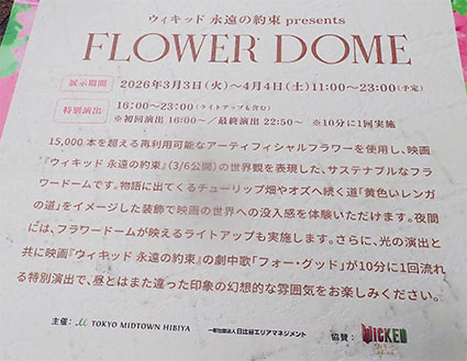 3月6日より東宝シネマズで公開の映画”ウイキッド・永遠の約束”をイメージした艶やかな造花のフラワー・ドームと書かれていました。映画に登場するめまいがするほどの花の群れと黄色のレンガの道が表現されているようです。