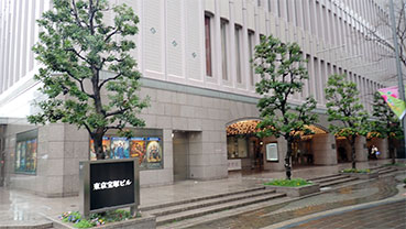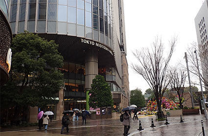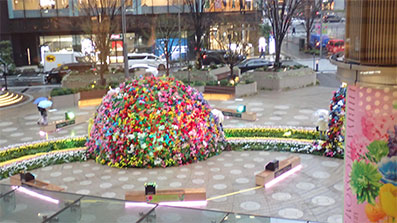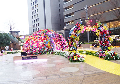切符を購入後、有楽町で昼食をとるべく再度ビルの入り口に戻ります。映画館のあるミッドタウン日比谷の入口のイルミネーションが時折飾られる場所に艶やかな花のドームが見えます。