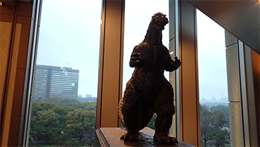 16:47・劇場の廊下から広い場所に出てくると現実の世界が広がっています。日比谷公園をバックにお馴染みのゴジラ像が見えます。