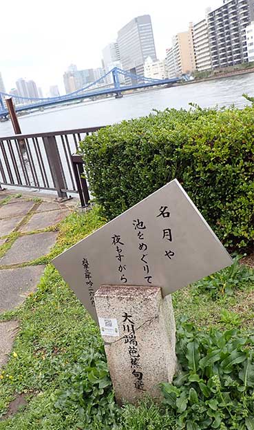 句碑を見てから再度後ろを振り返って右岸の浜町公園から左岸に渡った中央大橋を見てみました。広大に広がる川面を見ていると東京にこれ程大きな川が何事もなく流れていることが極めて不思議な事に思えてきました。